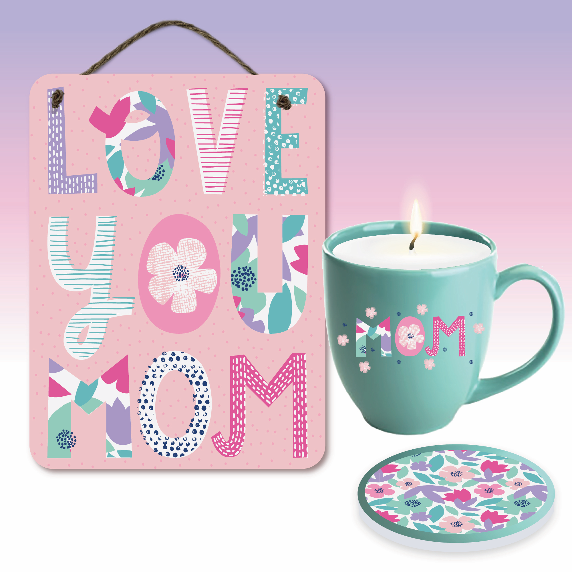 Mom ๐Ÿ’• I Love You Mom Wooden Wall Art with Twine, Soy Candle in Mug & Coaster ~ 4 Piece Set